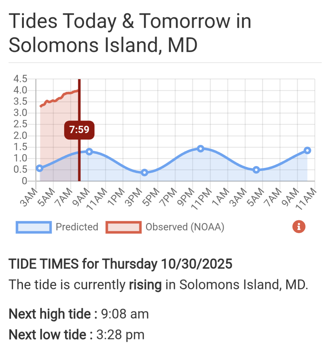 No amount of wind, rain or high tides will stop a warm welcome from Solomons Island Yacht Club. Scrambled to find floating dock with electricity while fixed dock marinas were underwater. “Wow! Never witnessed it that high.”